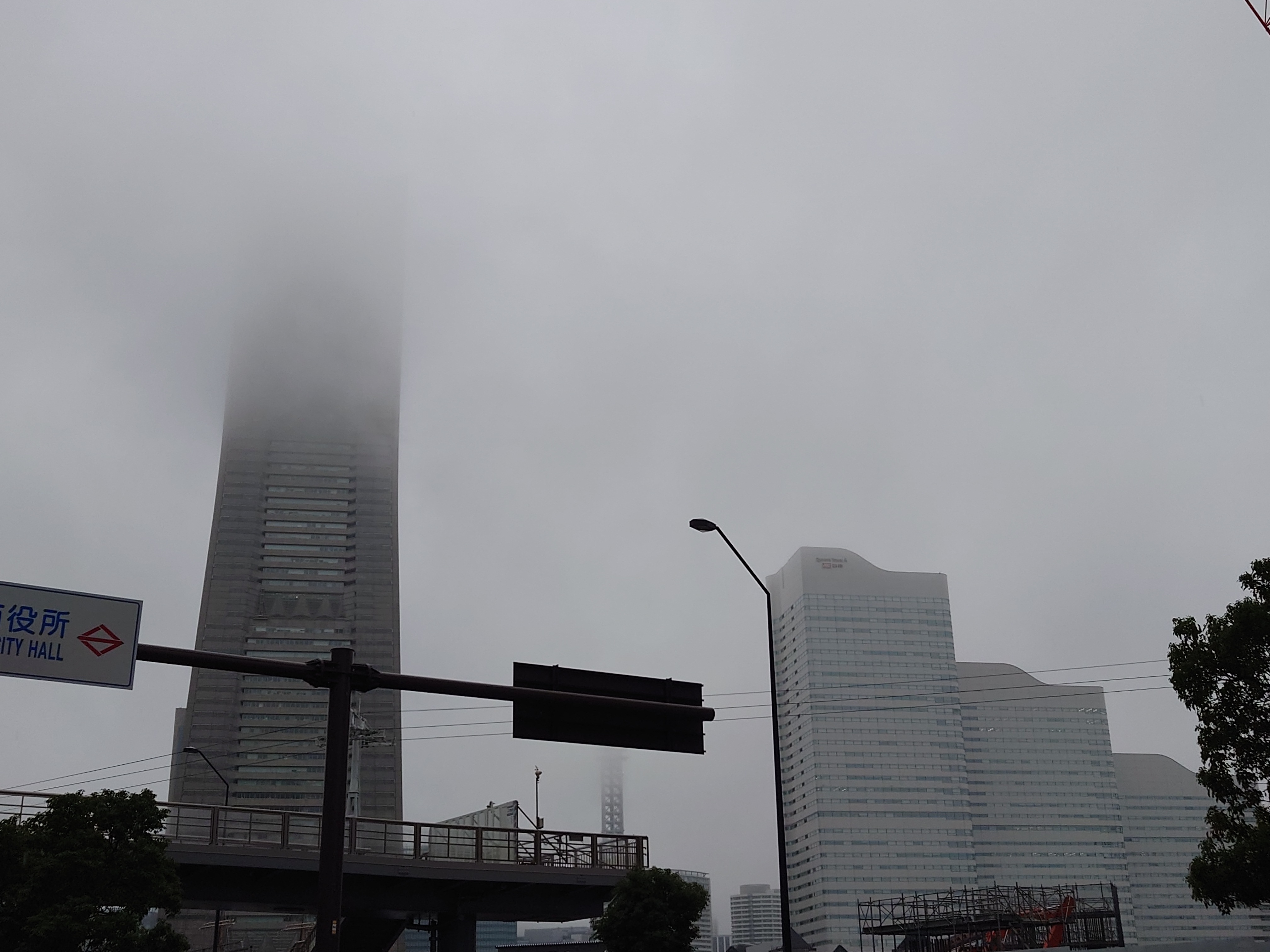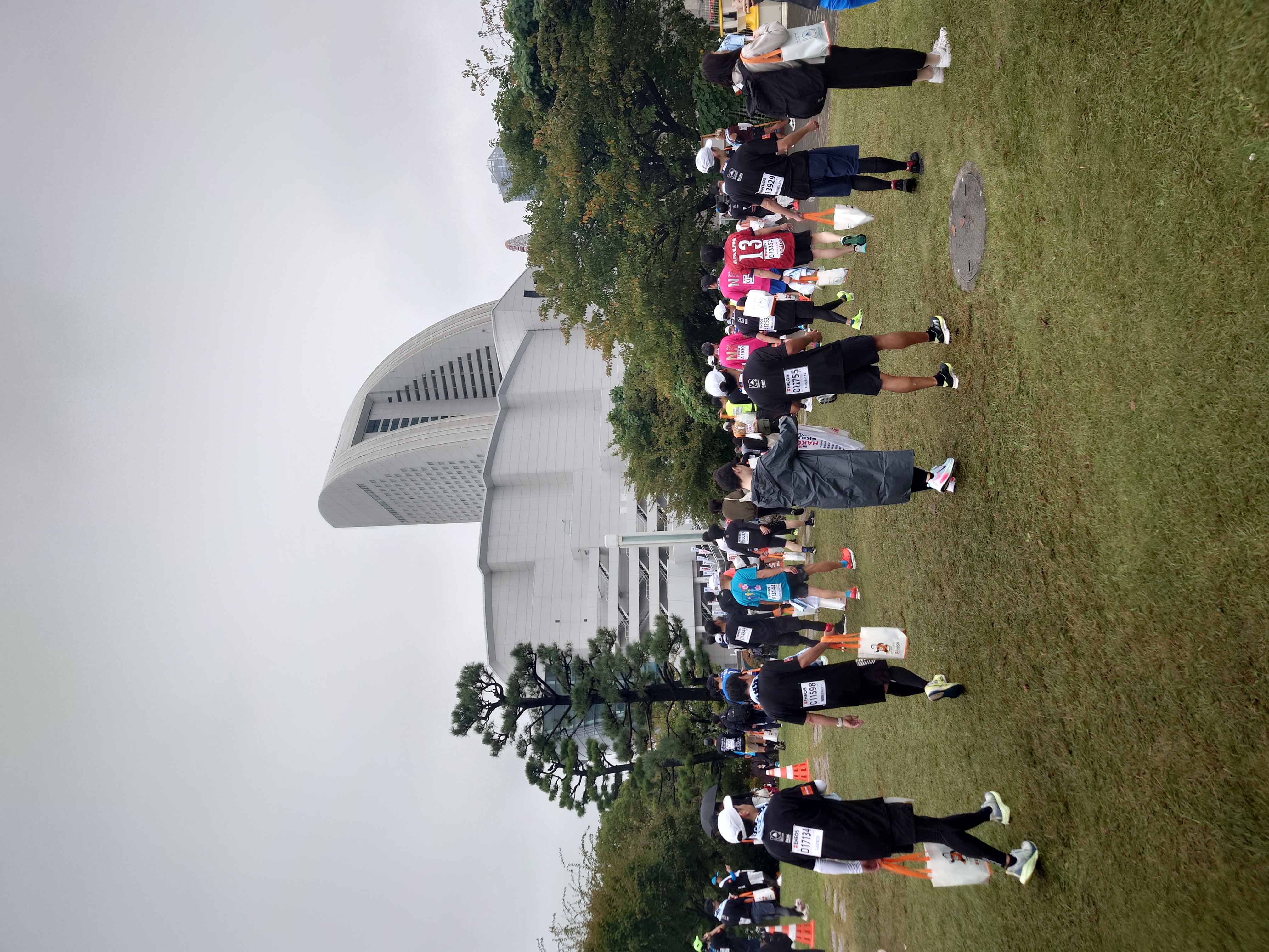天気は生憎の雨、スタート地点から見えるランドマークタワーも上層部が雲に隠れています。天気予報もレース終了まで雨模様、不安なスタートです。