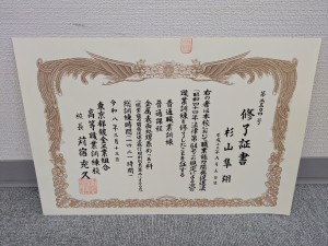 また、卒業試験に合格することで、めっき技能士2級の学科試験免除の資格もいただくことができます。最初はこの資格をもらうために通っているというモチベーションでしたが、通っているうちに一緒に学ぶ仲間たちと今日も会えるという気持ちが大きくなり、何とか一年間通いあげることができました。